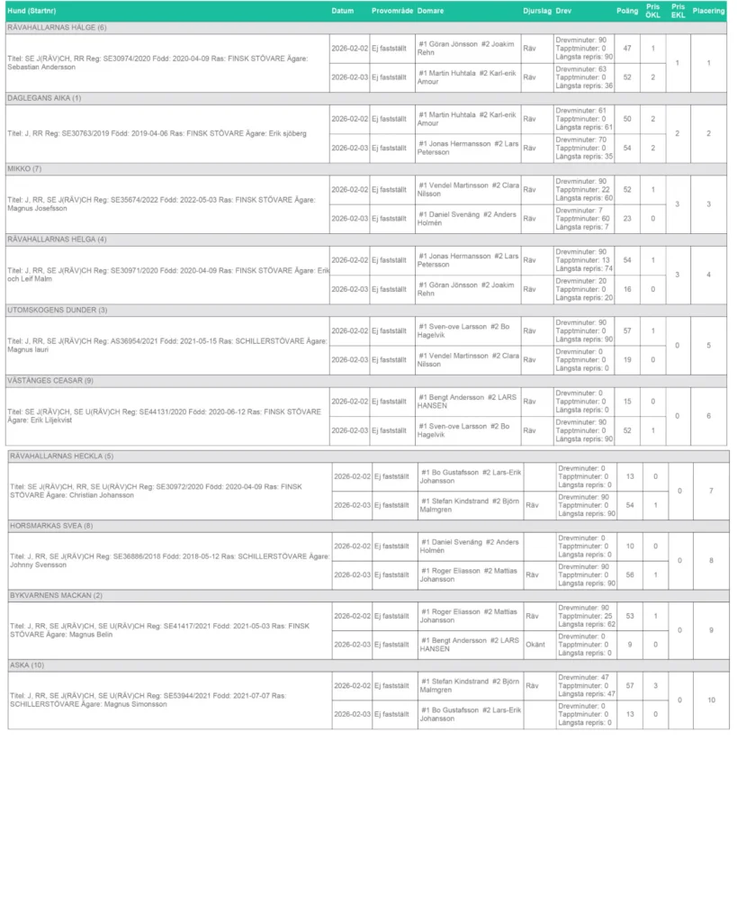Slutresultat Räv SM 2026 via denna länk från jaktjournalen: Klicka här